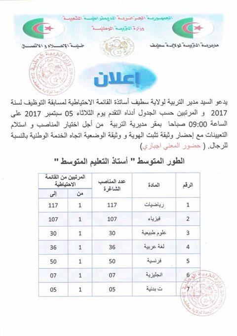 استدعاء قوائم احتياط مسابقة الاساتذة 2017 مديرية التربية لولاية سطيف