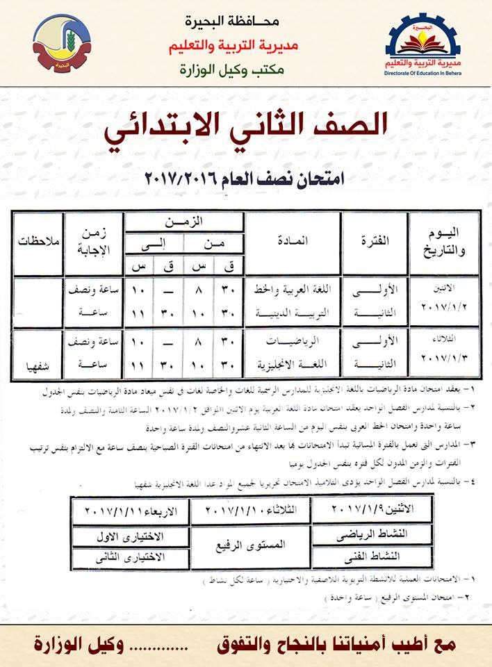 جدول امتحانات الشهادة الابتدائيه الترم الاول 2018 محافظة البحيره الصف السادس الابتدائى
