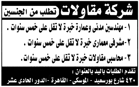 وظائف خالية فى شركة مقاولات كبرى منشور فى 13 2 2020